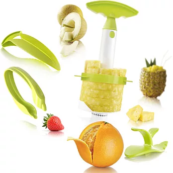本商品一組 5 件入、含鳳梨切片器、切八片器、去蒂器(草莓)、去皮器(柑橘)、切片器(哈密瓜) 各 1;適用洗碗機。硬皮多汁的鳳梨,處理起來非常費時;搭配此款切片器僅需簡單三步驟,即可迅速的螺旋狀取出鳳梨果肉;先切掉鳳梨頭、接著向下旋轉慢慢切片,搭配切八片器使用,可快速切片。清洗時也可將握柄處按鈕卸掉分離。因水果品種不同而可能導致果肉軟硬與熟度的差異,而影響效果;而較硬的果肉可能施力上較不方便向下旋轉切片。有如小鎳子般外型設計的去蒂器,方便您直接夾起草莓蒂頭或去除細微枝葉。一體成型彈性設計,方便手握施力。處理柑橘類水果皮時,最怕因厚薄度不同的果皮,在手撥的過程中損害到果肉。此款削皮器只需簡單三步驟,即可迅速且完美地削皮。葉子型手握處方便指頭施力、也不滑手。處理哈密瓜等多汁果類,僅需簡單四步驟,即可迅速切開哈密瓜與去籽,並完整的切片享用。適用哈密瓜、香瓜類軟皮食材,但不適用西瓜等硬皮水果。
